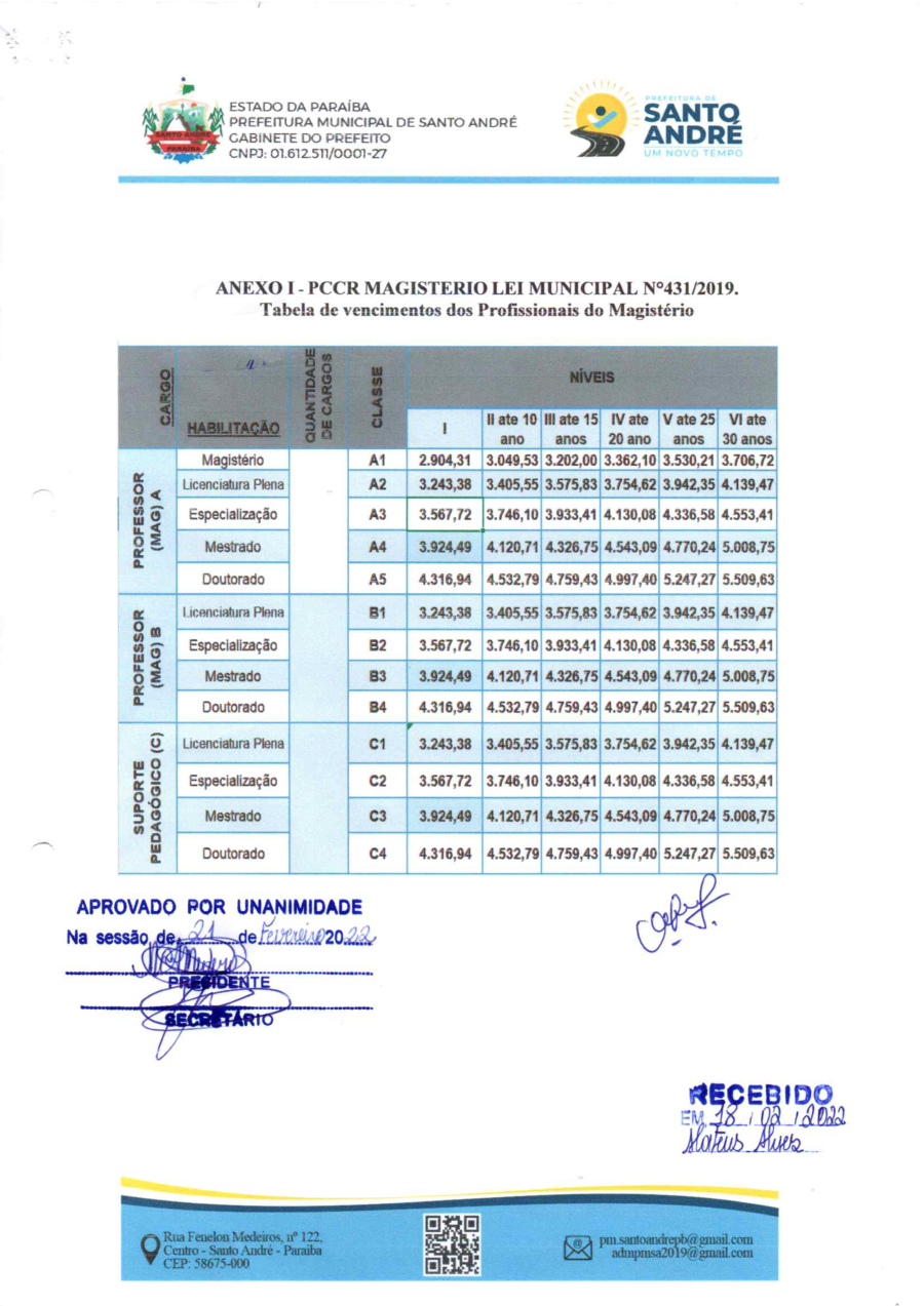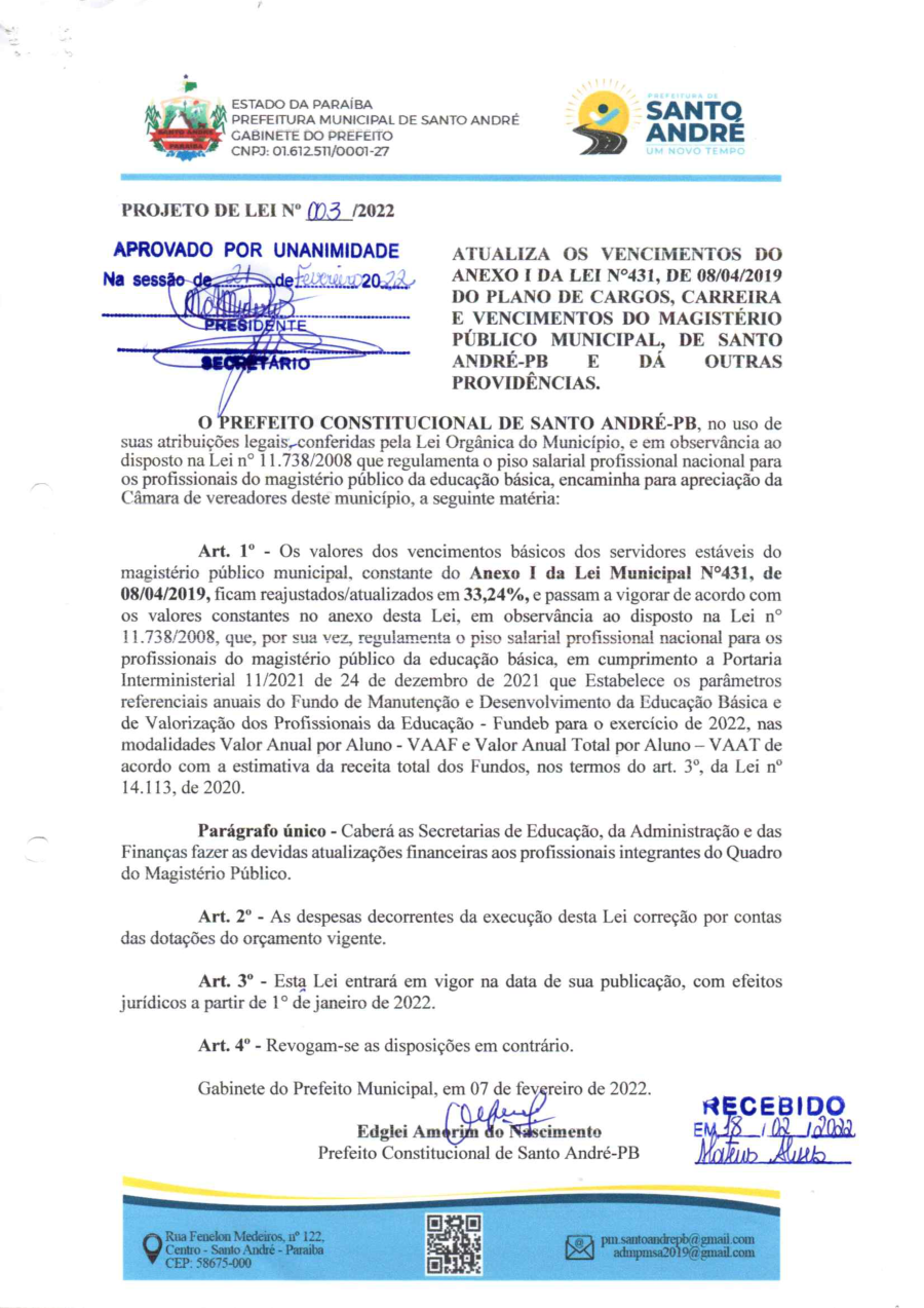 PROJETO DE LEI 0003/2022 – ATUALIZA OS VENCIMENTOS DA LEI N° 431 DE 08/04/2019 DO PLANO DE CARGOS, CARREIRA E VENCIMENTO DO MAGISTÉRIO