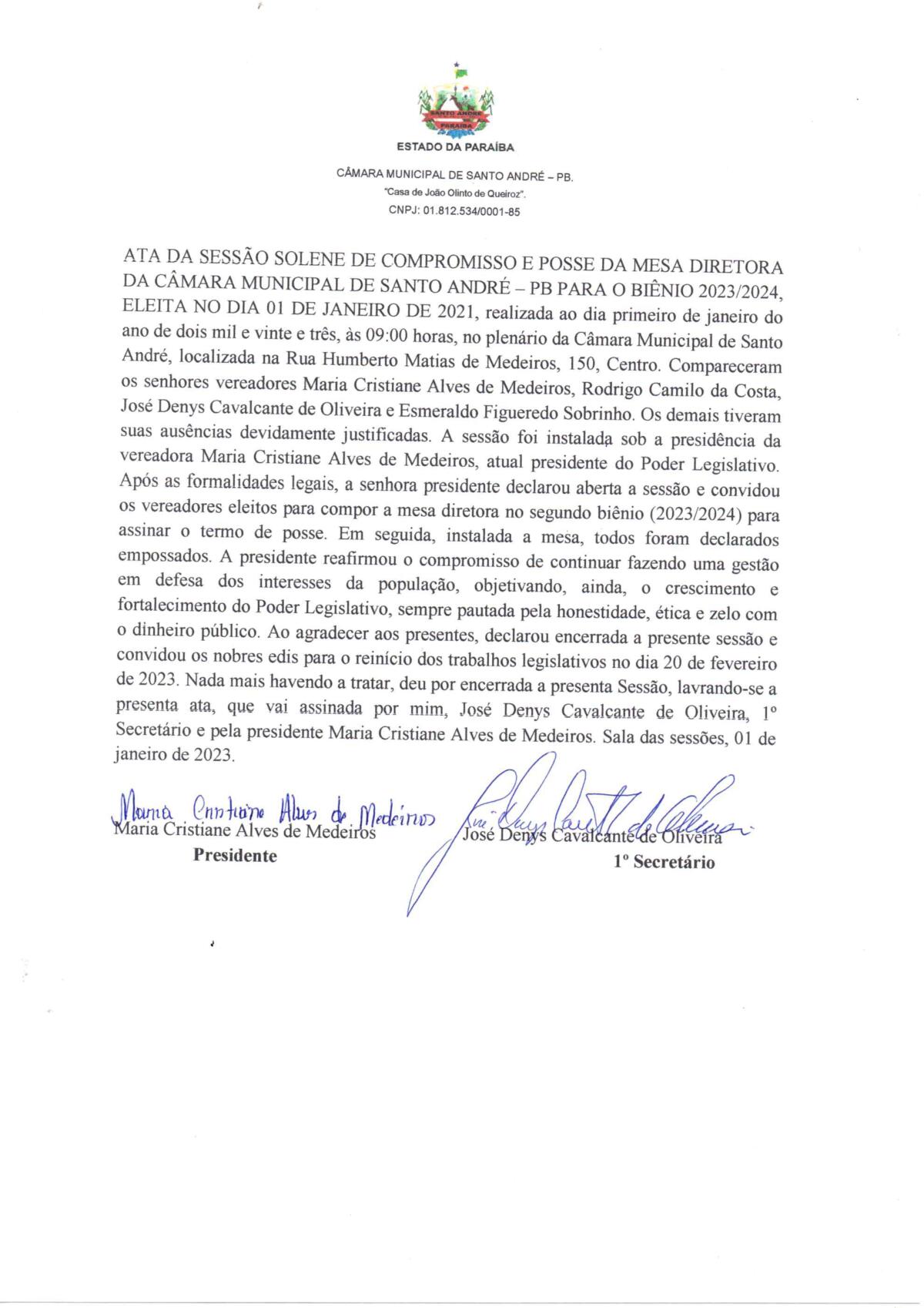 ATA DA SESSÃO SOLENE DE COMPROMISSO E POSSE DA MESA DIRETORA DA CÂMARA MUNICIPAL