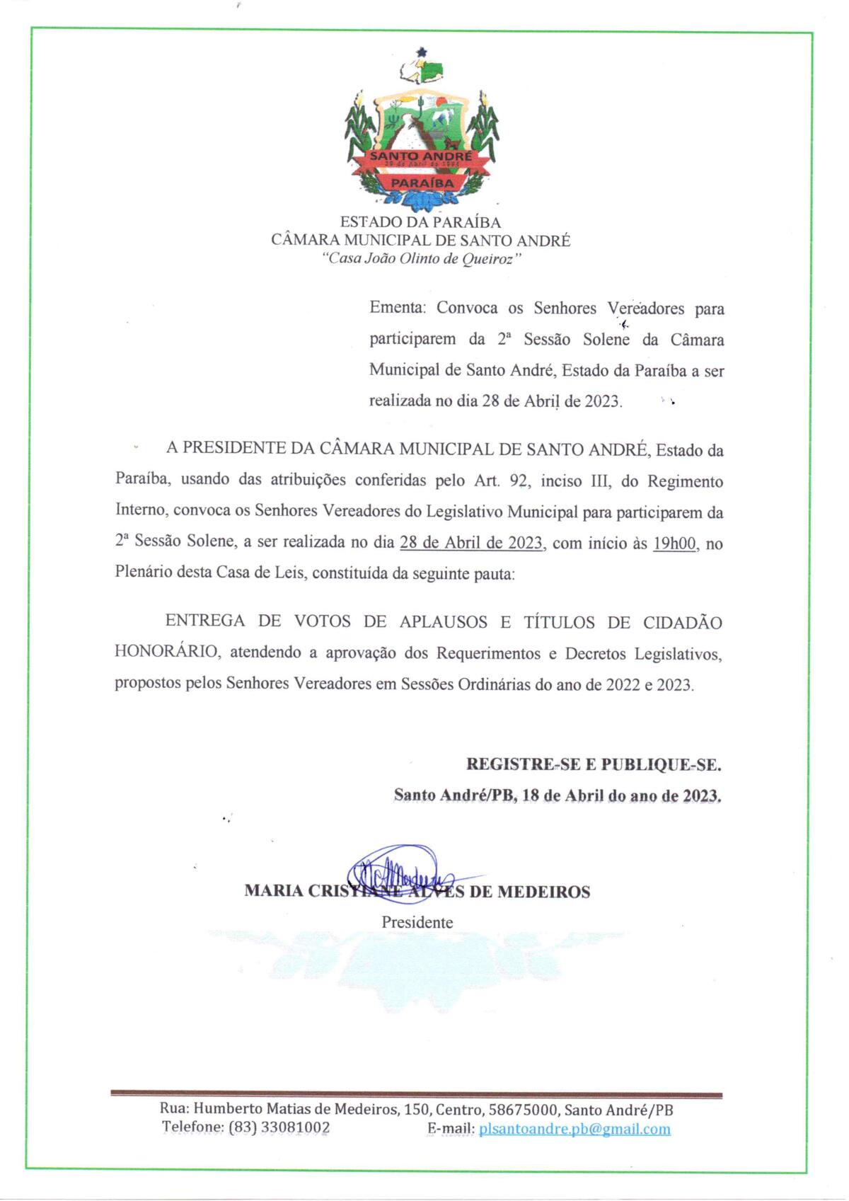 CONVOCAÇÃO – CONVOCA OS SENHORES VEREADORES PARA PARTICIPAREM DA 2ª SESSÃO SOLENE DA CÂMARA MUNICIPAL A SER REALIZADA NO DIA 28 DE ABRIL DE 2023