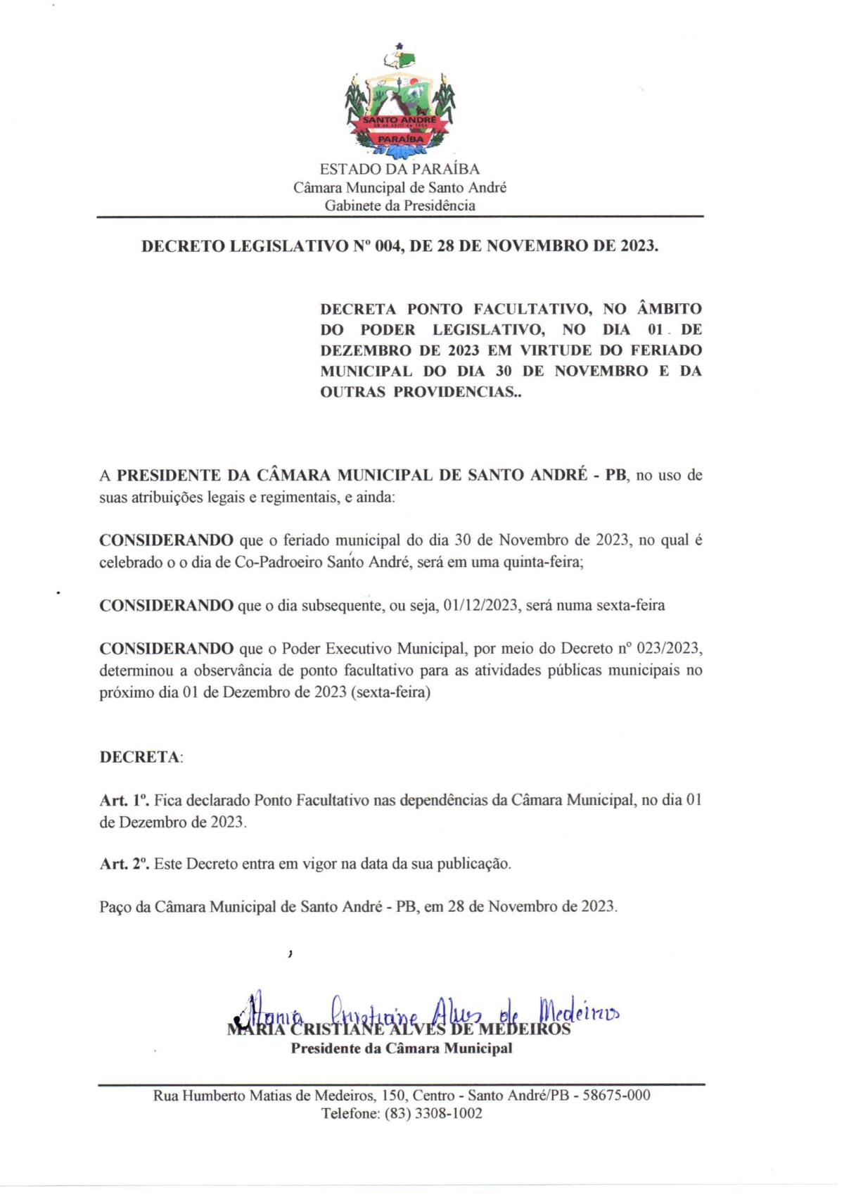 DECRETO LEGISLATIVO N° 0004/2023 – DECRETA PONTO FACULTATIVO NO ÂMBITO DO PODER LEGISLATIVO