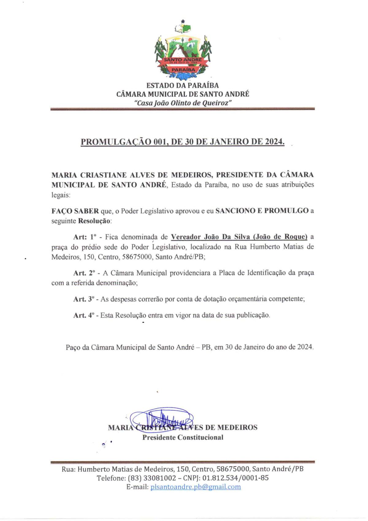 PROMULGAÇÃO N° 0001/2024 – DENOMINA NOMEAÇÃO DE PRAÇA