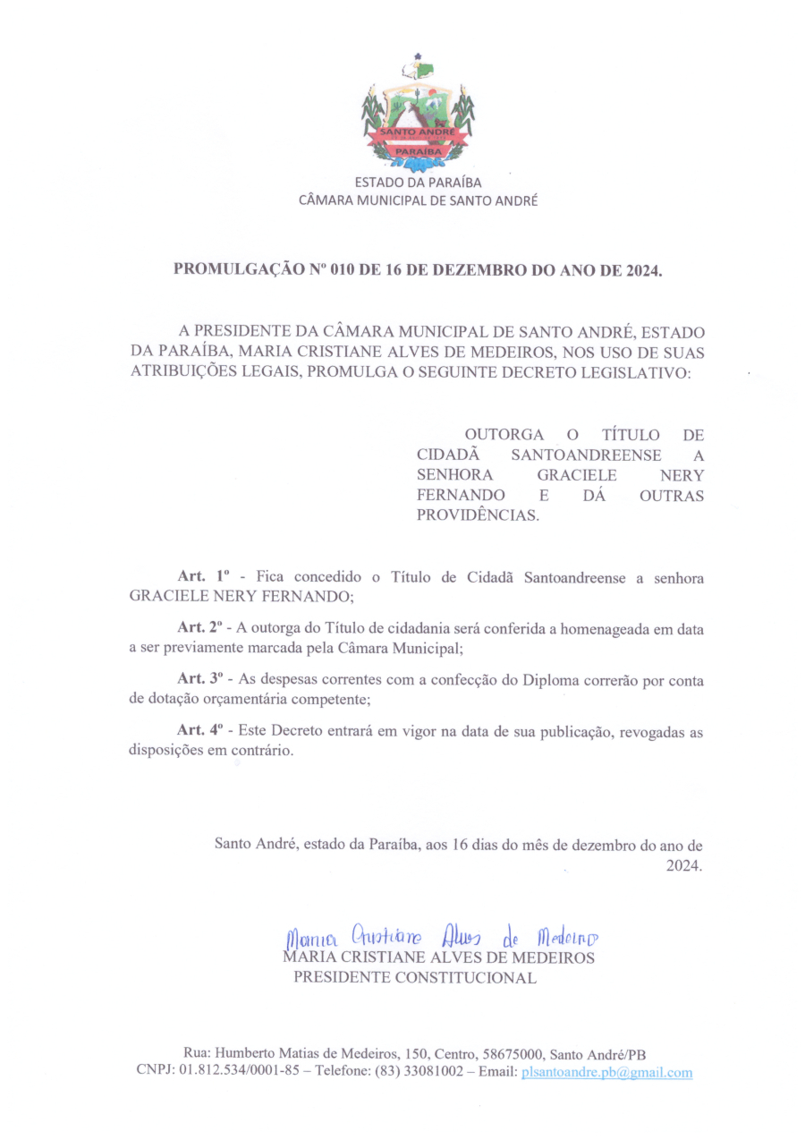 PROMULGAÇÃO N° 0010/2024 – OUTORGA O T´TULO DE CIDADÃ SANTOANDREENSE A SENHORA GRACIELE NERY FERNANDO