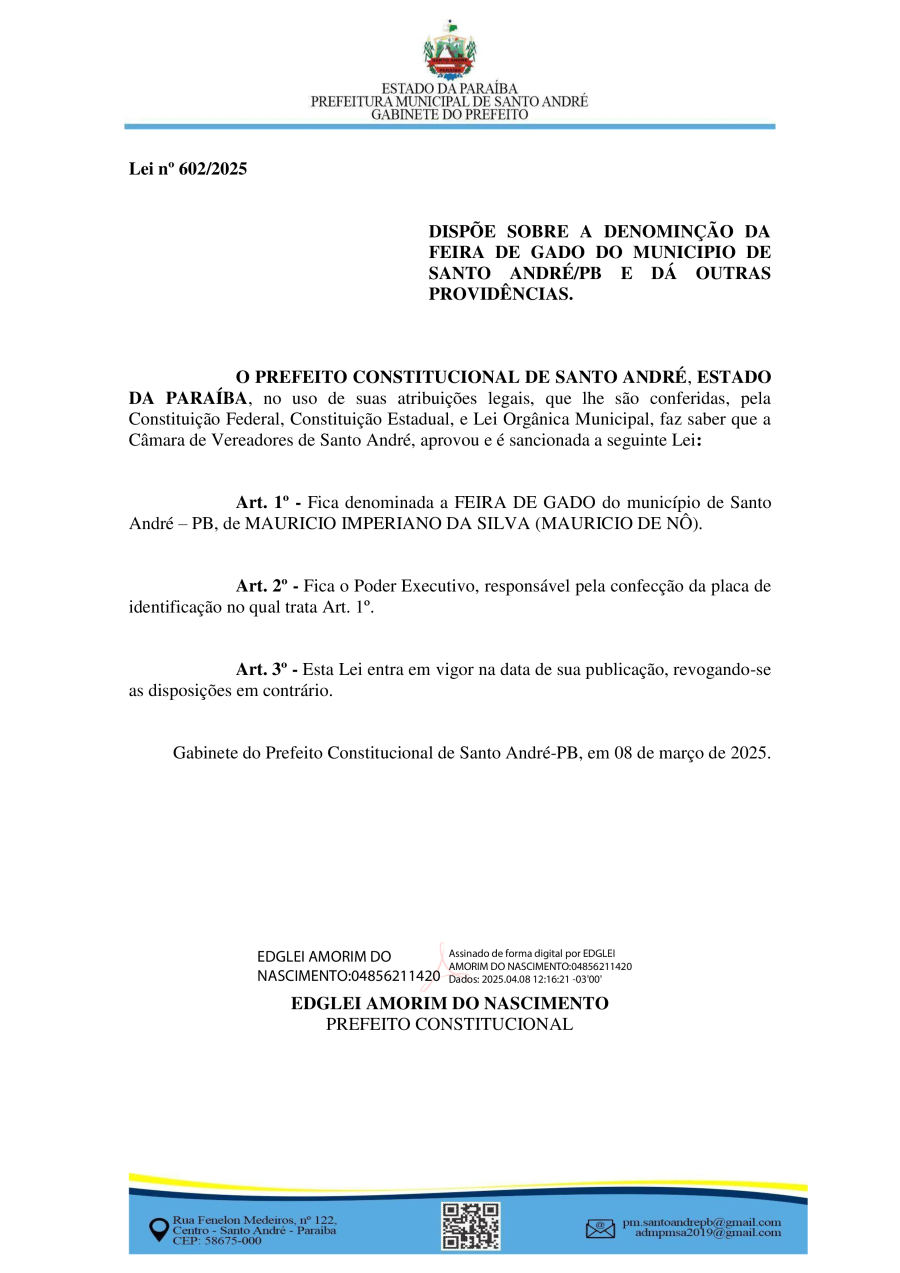 LEI Nº 602/2025 – DISPÕE SOBRE A DENOMINÇÃO DA FEIRA DE GADO DO MUNICIPIO DE SANTO ANDRÉ/PB E DÁ OUTRAS PROVIDÊNCIAS.