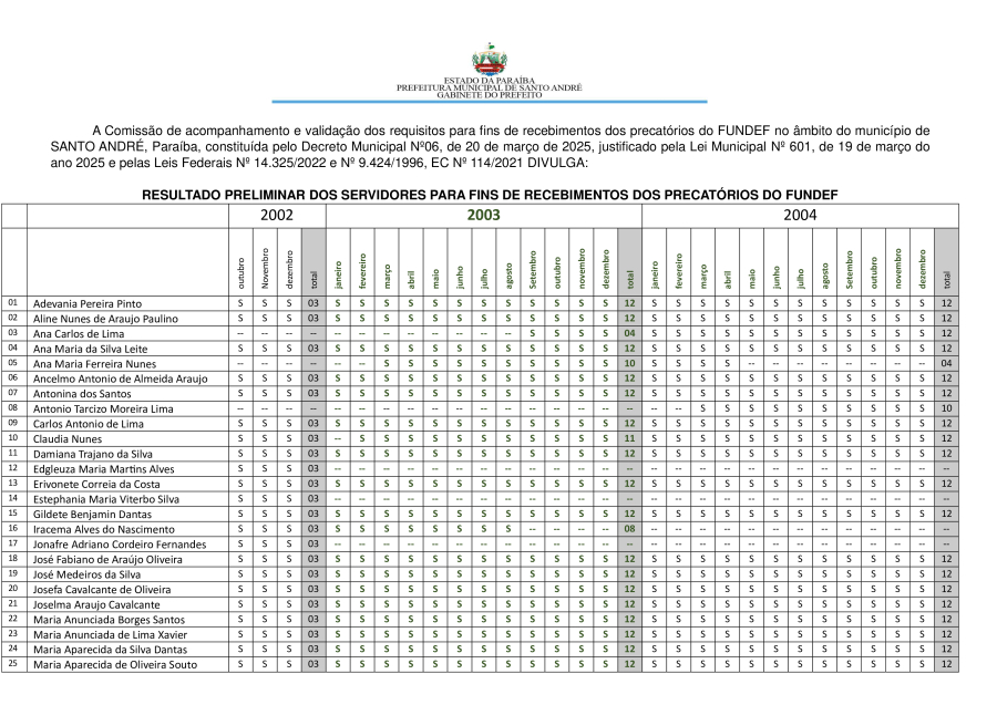 RESULTADO PRELIMINAR DOS SERVIDORES PARA FINS DE RECEBIMENTOS DOS PRECATÓRIOS DO FUNDEF