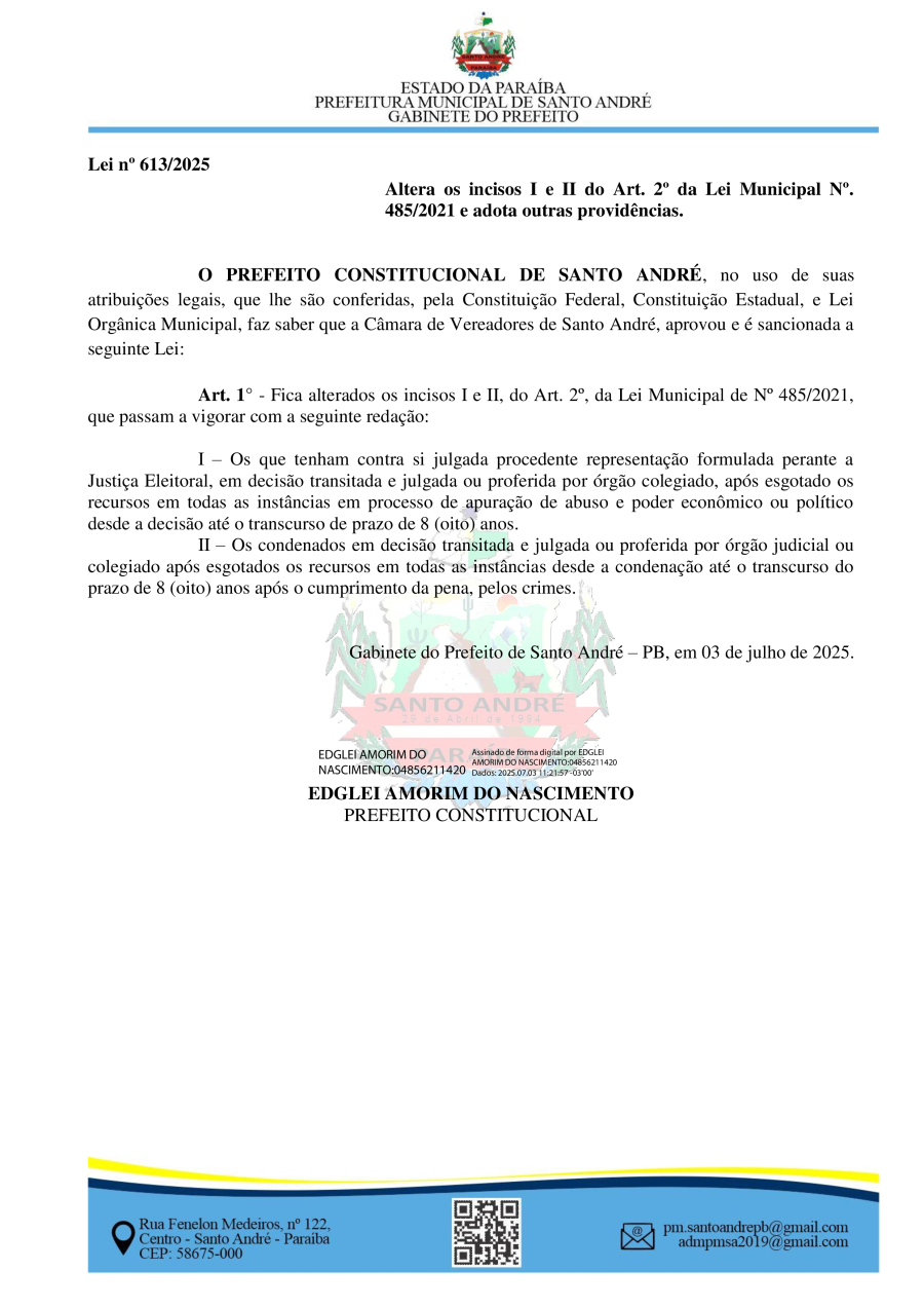 LEI Nº 613_2025 – ALTERA OS INCISOS I E II DO ART. 2º DA LEI MUNICIPAL N° 485.2021 E ADOTA OUTRAS PROVIDENCIAS.