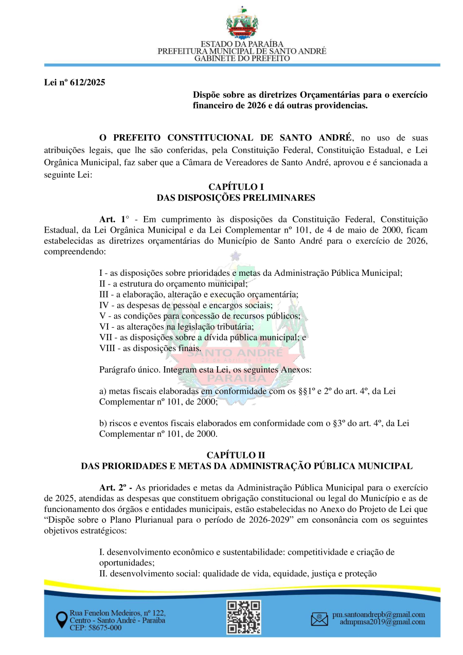LEI Nº 612_2025 – DISPÕE SOBRE AS DIRETRIZES ORÇAMENTÁRIAS PARA O EXERCÍCIO FINANCEIRO DE 2026 E DÁ OUTRAS PROVIDENCIAS.