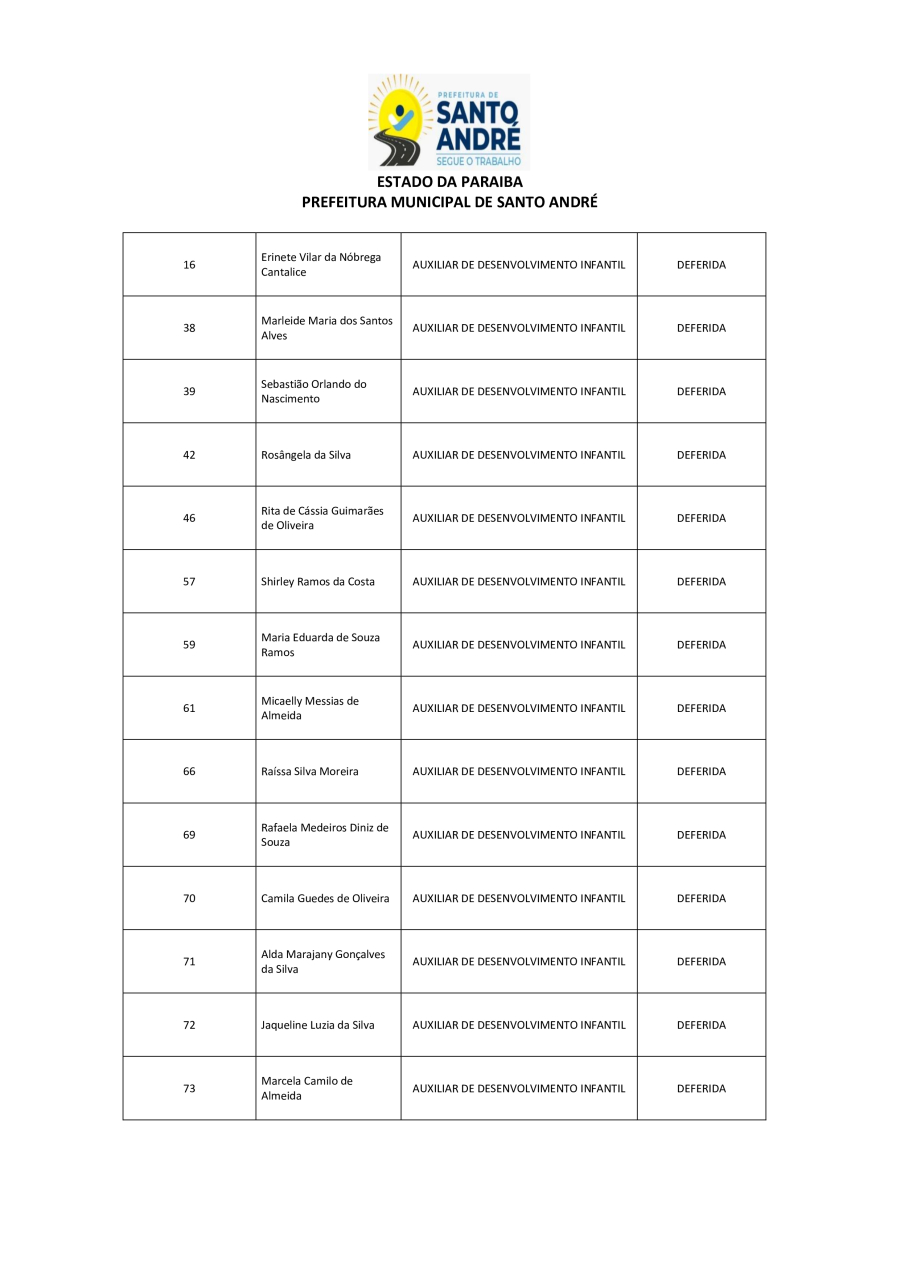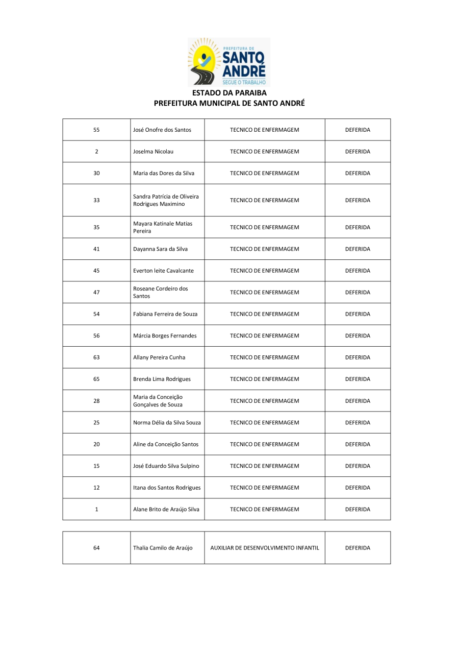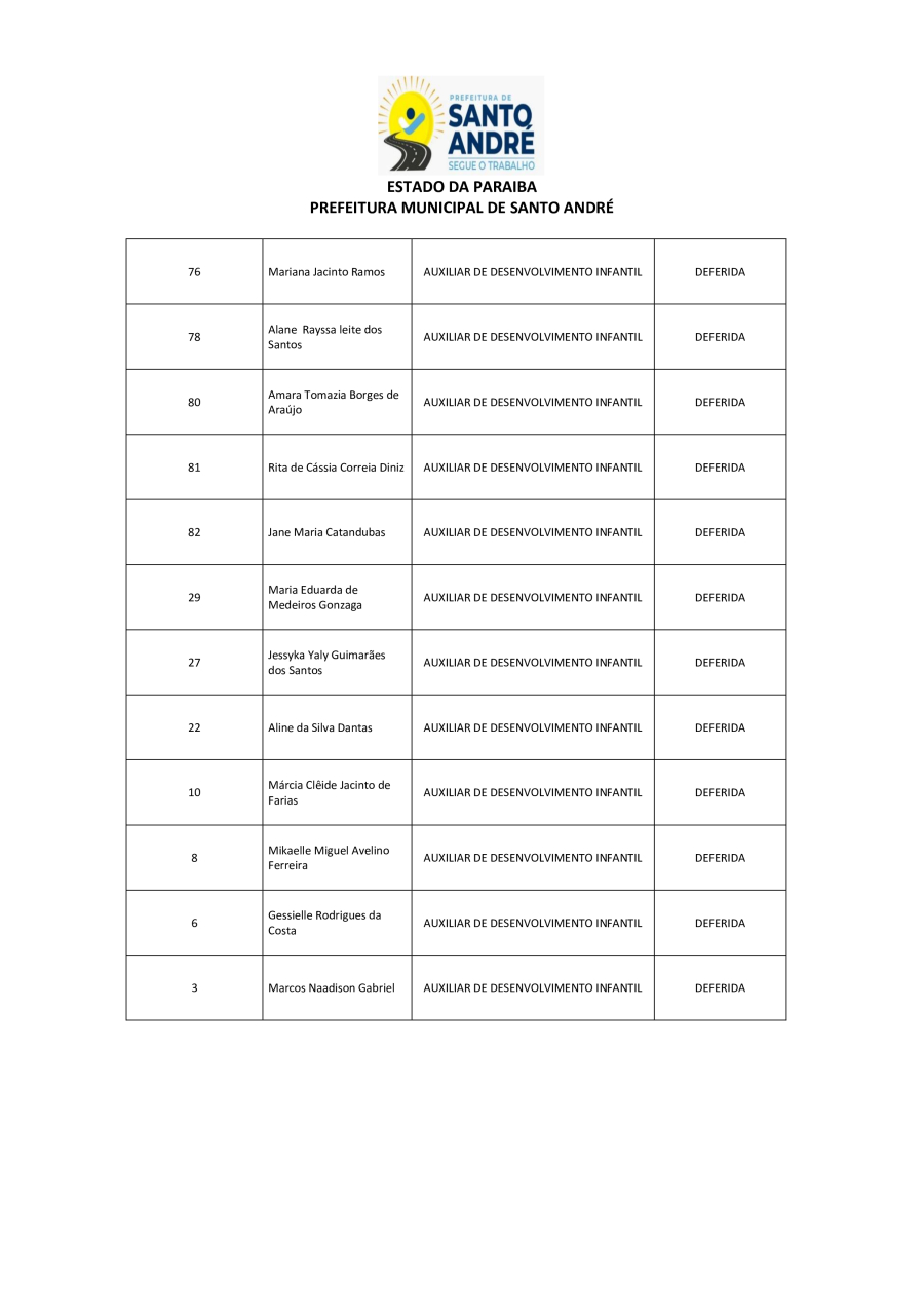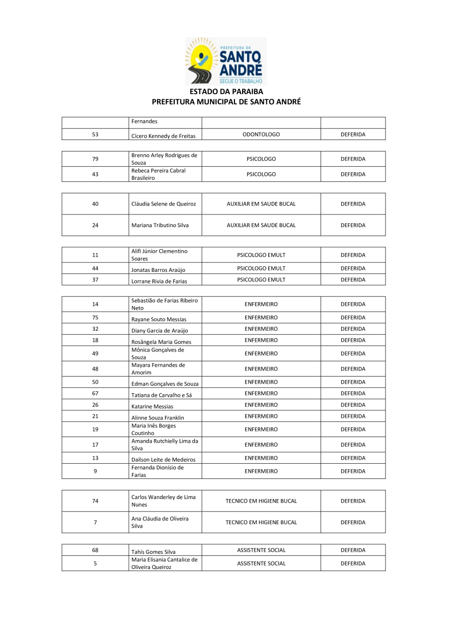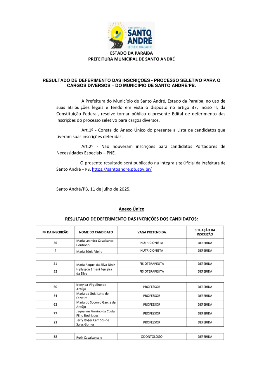 RESULTADO DE DEFERIMENTO DAS INSCRIÇÕES – PROCESSO SELETIVO PARA O CARGOS DIVERSOS – DO MUNICIPIO DE SANTO ANDRÉ/PB.