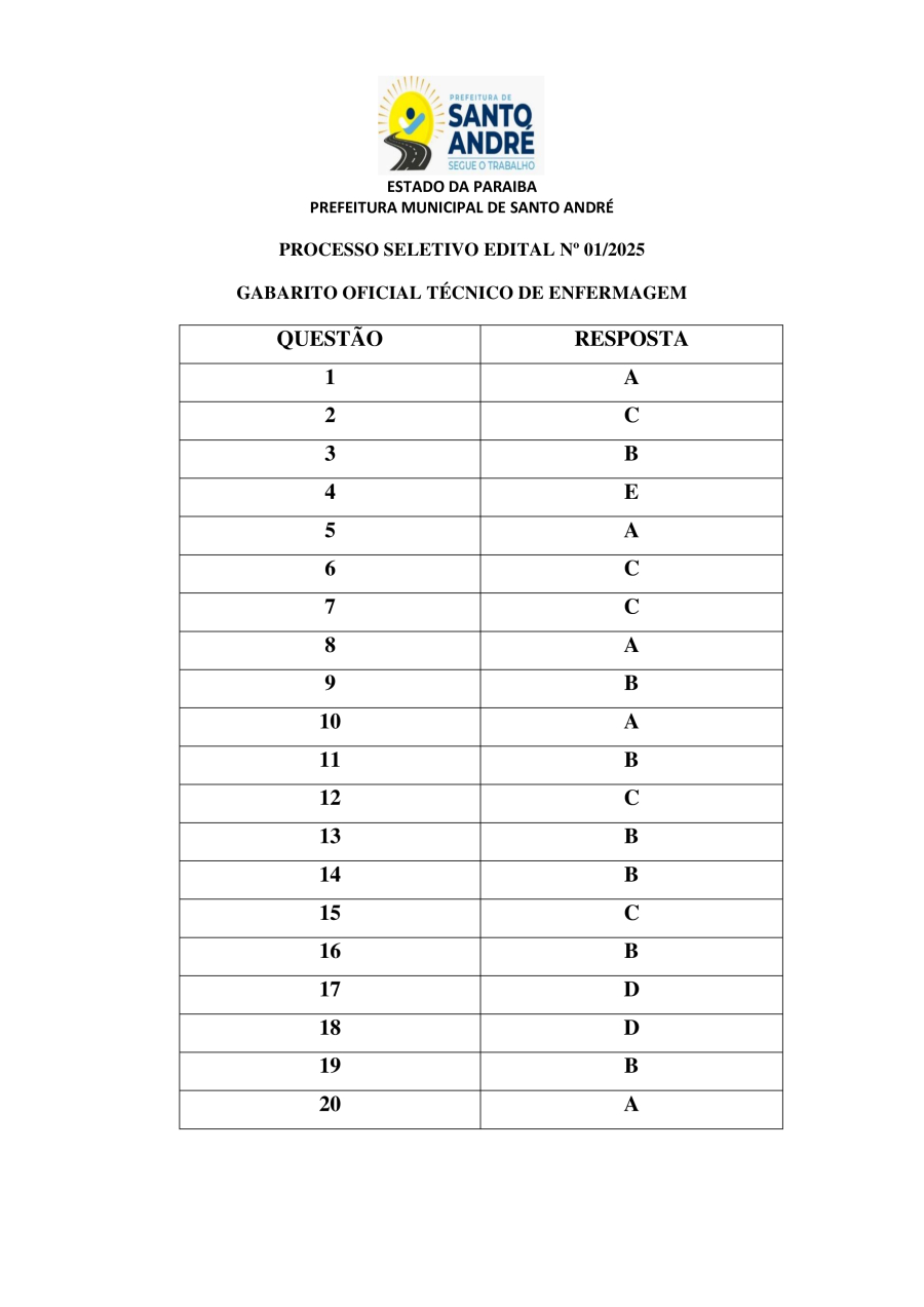 PROCESSO SELETIVO EDITAL Nº 01/2025 GABARITO OFICIAL TÉCNICO DE ENFERMAGEM