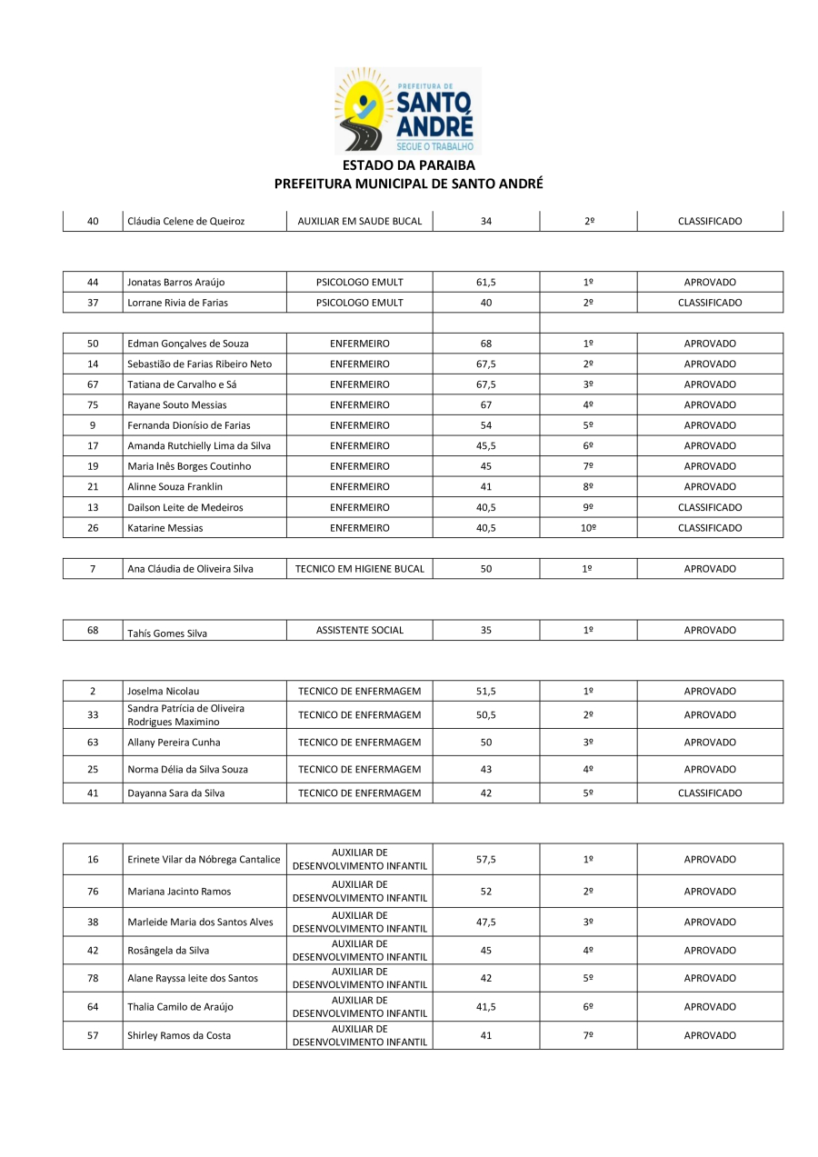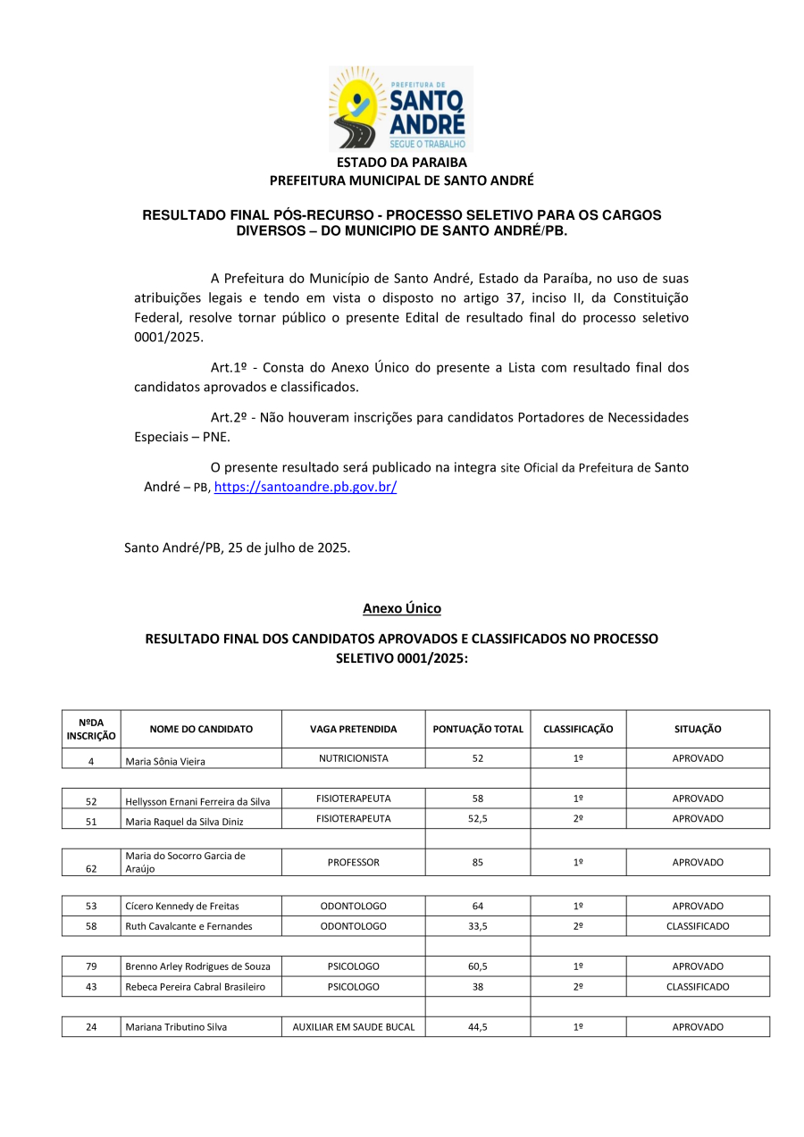 RESULTADO FINAL PÓS-RECURSO – PROCESSO SELETIVO PARA OS CARGOS DIVERSOS – DO MUNICIPIO DE SANTO ANDRÉ/PB.