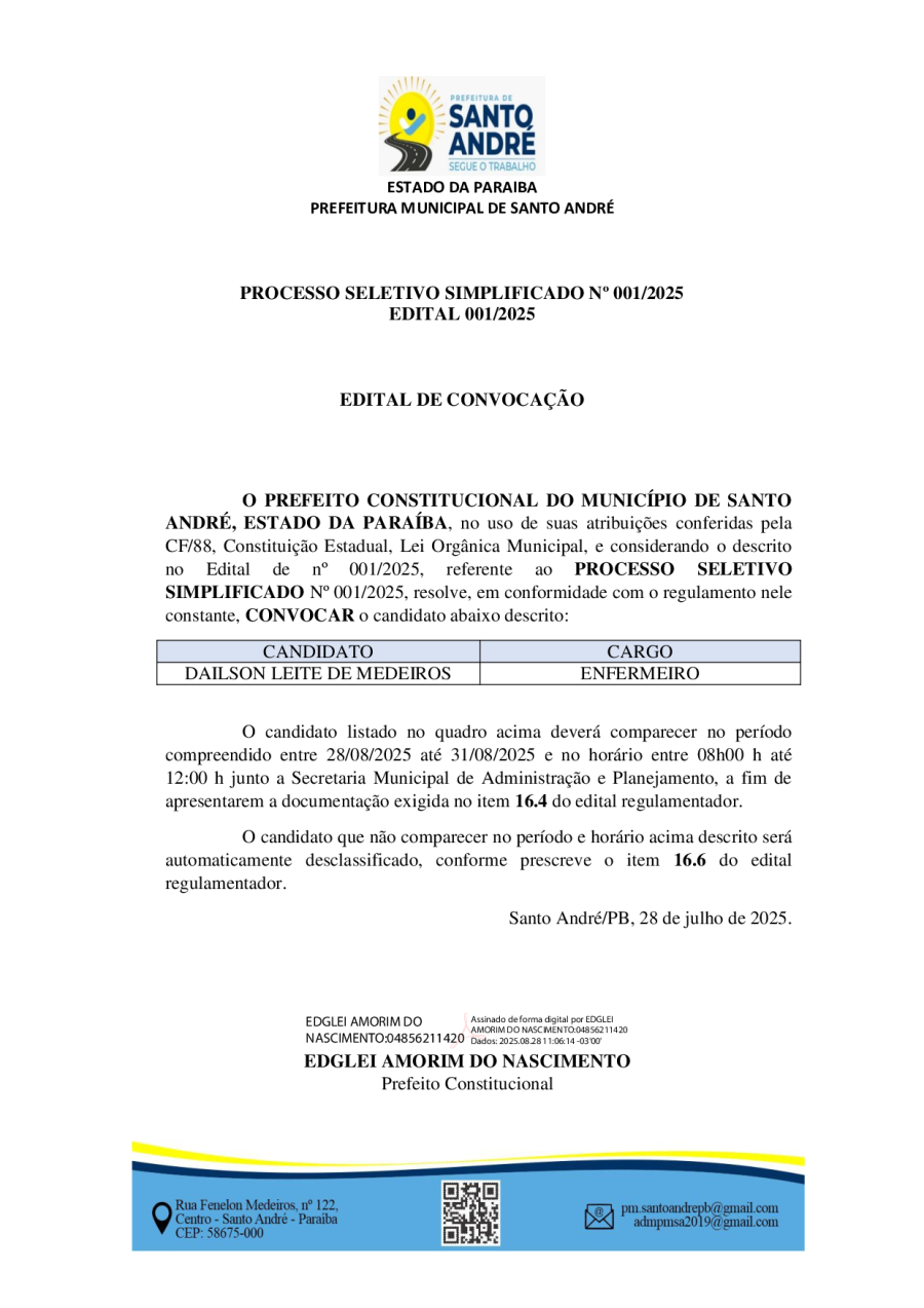 EDITAL DE CONVOCAÇÃO – PROCESSO SELETIVO SIMPLIFICADO Nº 001/2025