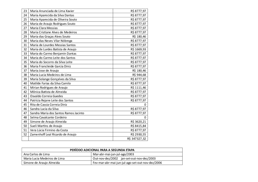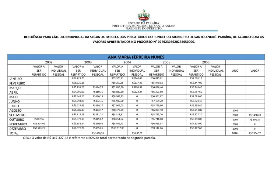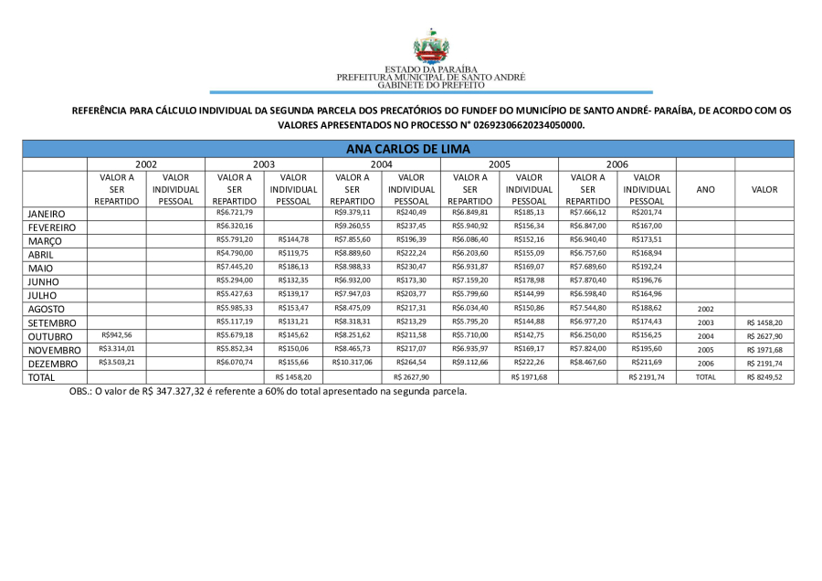 RESULTADO FINAL DA SEGUNDA PARCELA DOS PRECATÓRIOS DE SANTO ANDRÉ/PB PARA HOMOLOGAÇÃO