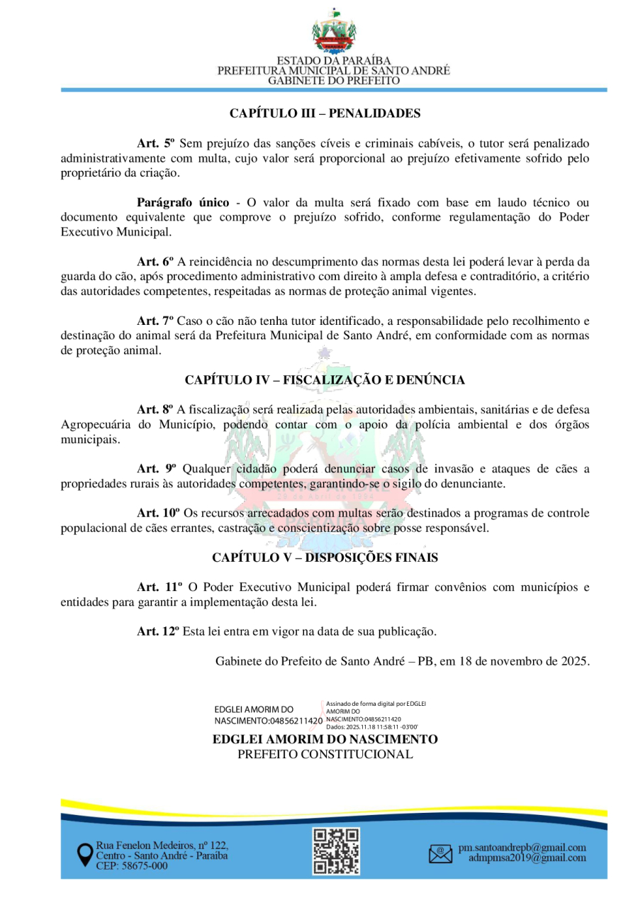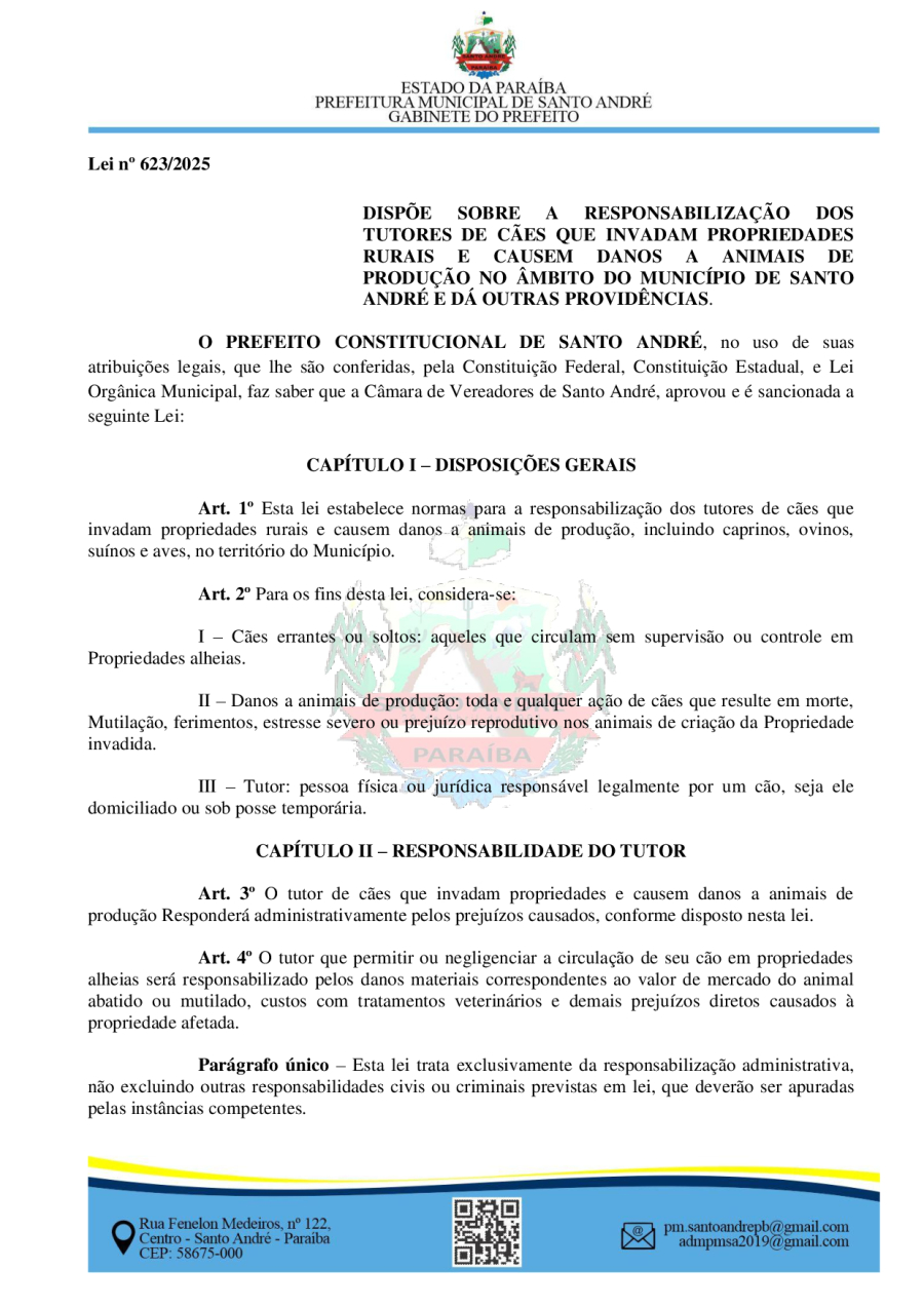 LEI Nº 623/2025 – DISPÕE SOBRE A RESPONSABILIZAÇÃO DOS TUTORES DE CÃES QUE INVADAM PROPRIEDADES RURAIS E CAUSEM DANOS A ANIMAIS DE PRODUÇÃO NO ÂMBITO DO MUNICÍPIO DE SANTO ANDRÉ E DÁ OUTRAS PROVIDÊNCIAS.